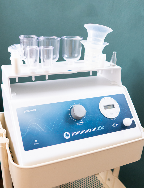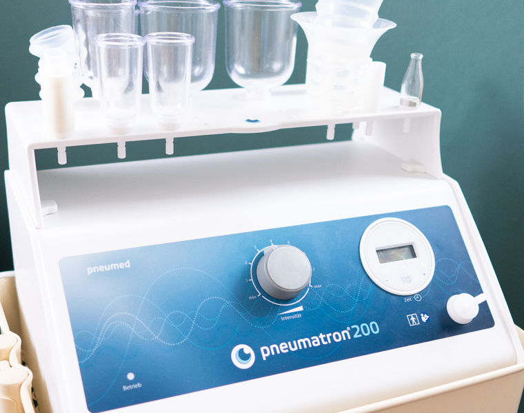Der Pneumatron® 200 ist ein medizinisches Gerät, das vor allem in der pneumatischen Pulsationsmassage (PPM)eingesetzt wird. Dabei handelt es sich um eine Therapieform, die Unterdruck- und Druckwellen nutzt, um verschiedene Gewebe im Körper zu stimulieren.